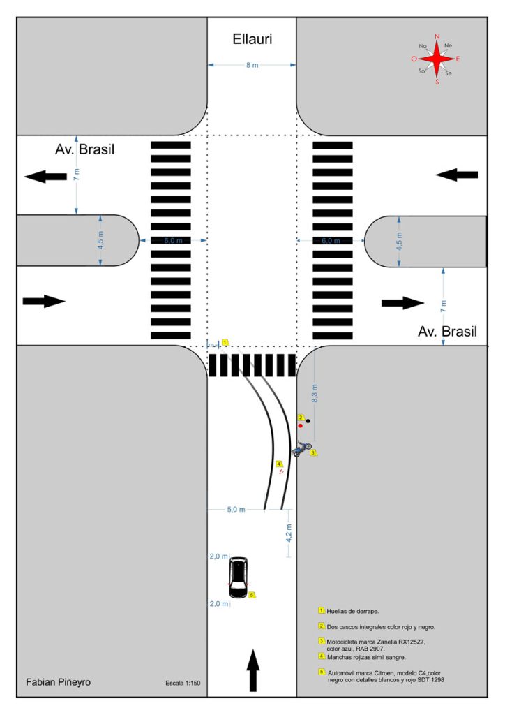 Cada informe integra análisis físico-mecánico, reconstrucción dinámica del siniestro y plano planimétrico detallado, donde se representan con exactitud los puntos de impacto, trayectorias y posiciones finales.